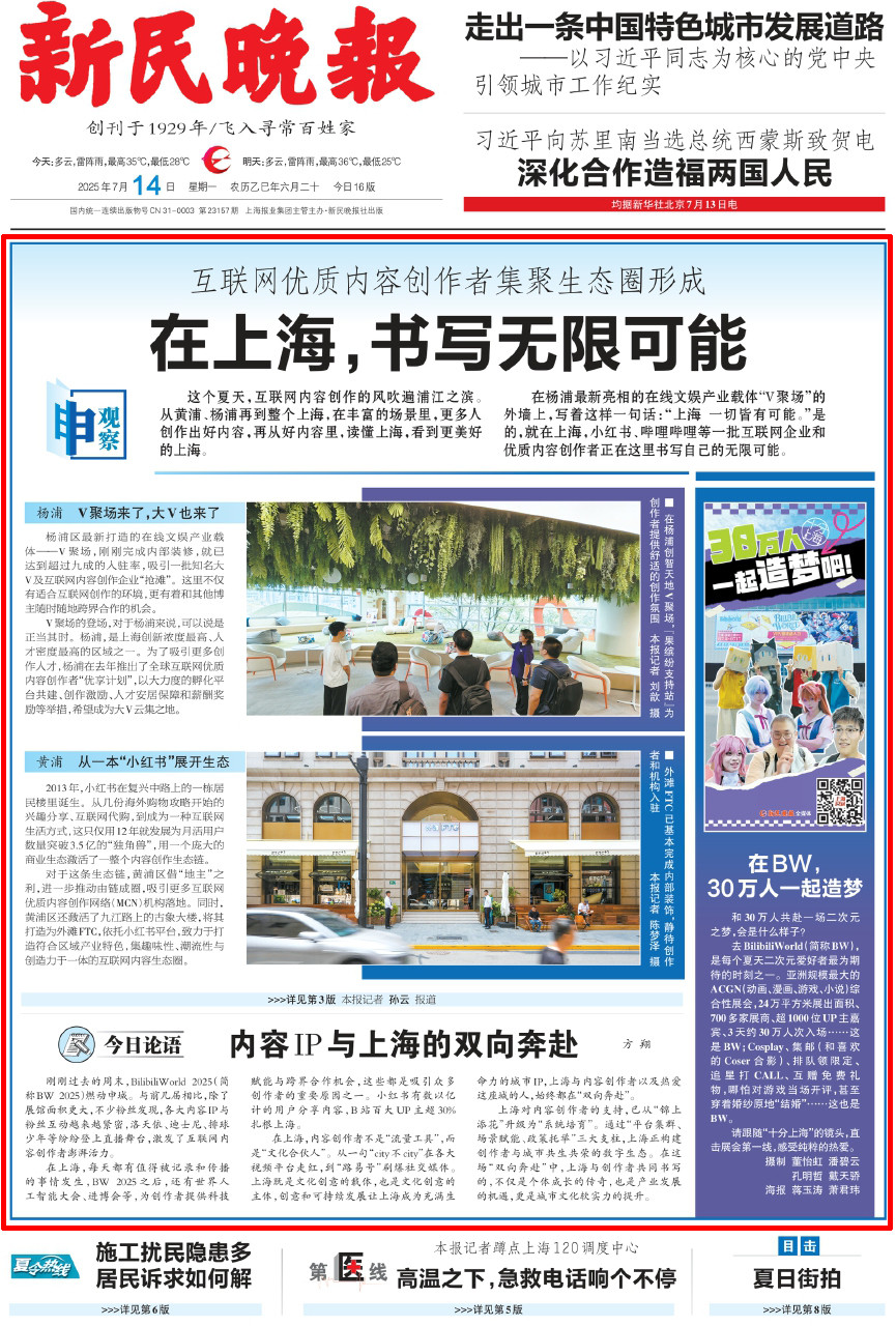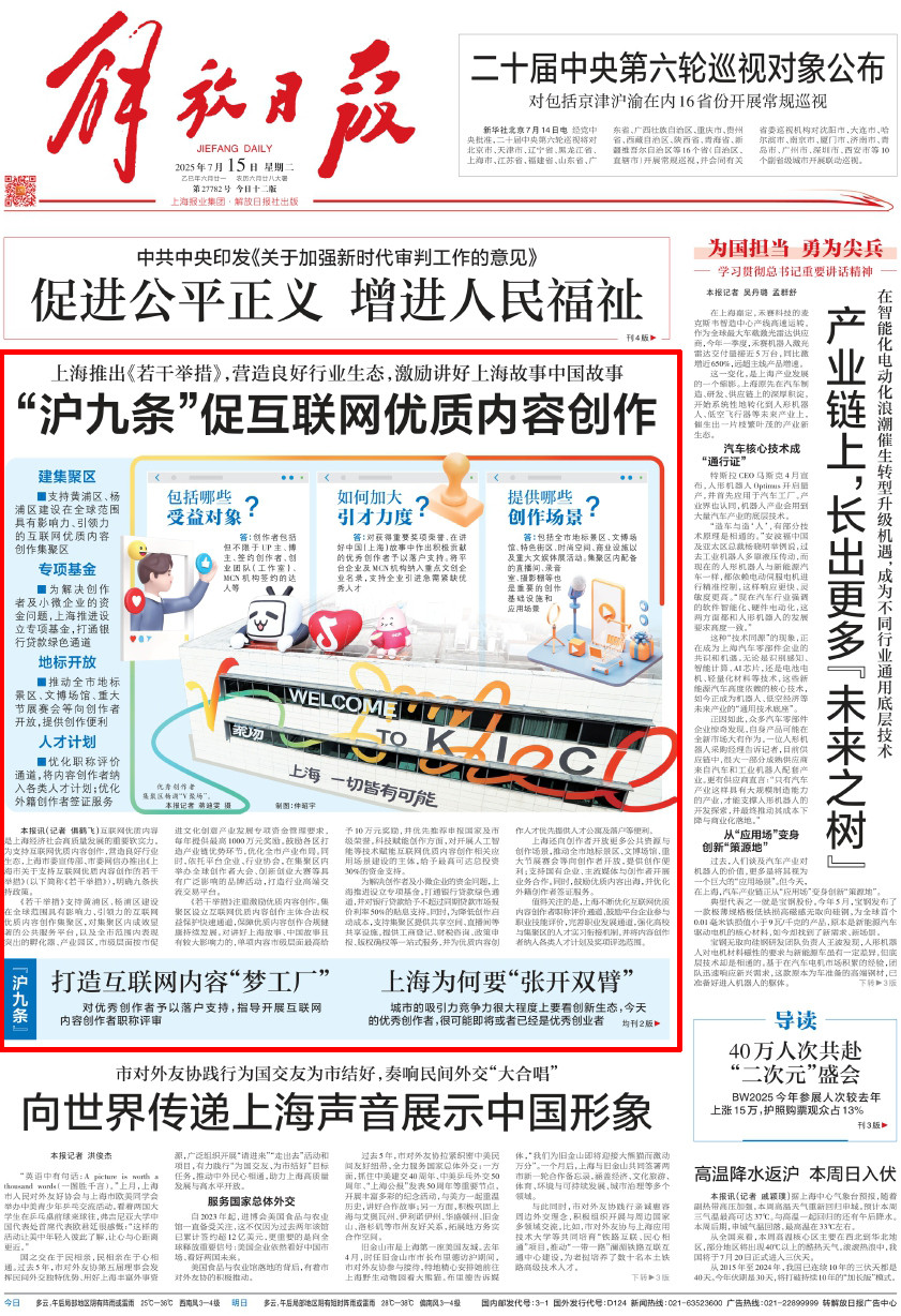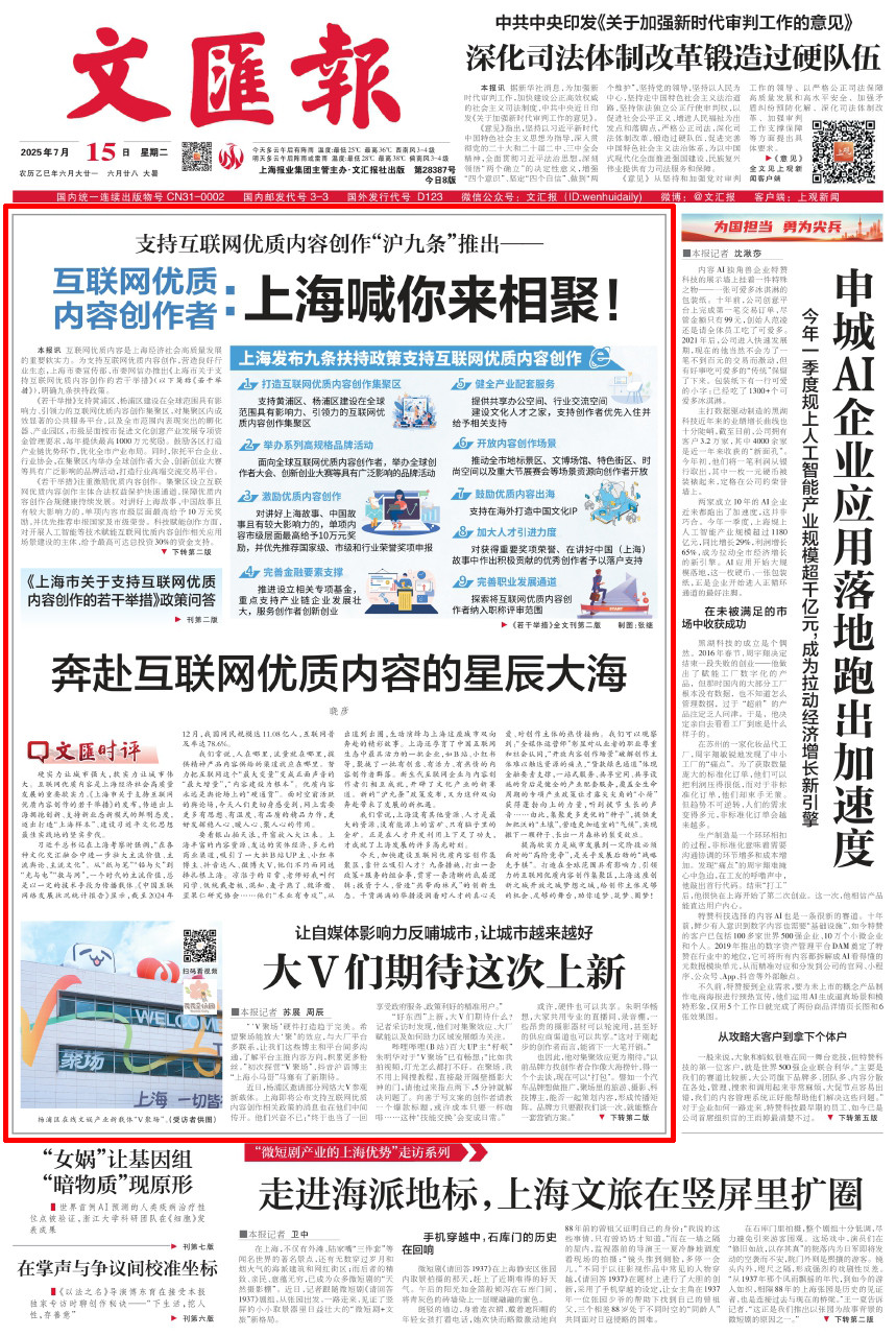 7月14日、15日出版的《解放日报》《文汇报》《新民晚报》均在头版聚焦互联网优质内容创作“沪九条”,回应为何上海向内容创作者“张开双臂”。