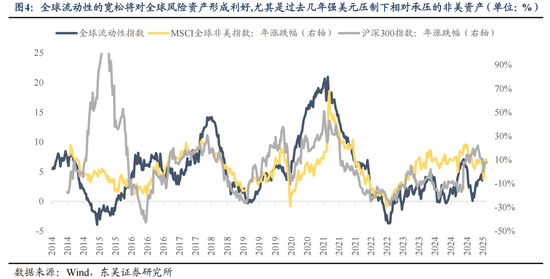 在美元下行周期中,全球风险资产、尤其是非美资产将会走强。我们在报告《基于全球流动性视角看A股当前性价比》中指出,全球流动性指标,与美元指数呈现明显负相关。从历史上来看,全球流动性往往顺应4-5年一轮的完整美元周期,呈现出周期性波动的规律。在全球流动性宽松、美元下行周期中,全球风险资产,尤其是非美资产将会走强。这也是为什么2025年初“东升西落”交易的起点是本轮美元指数的顶点。
